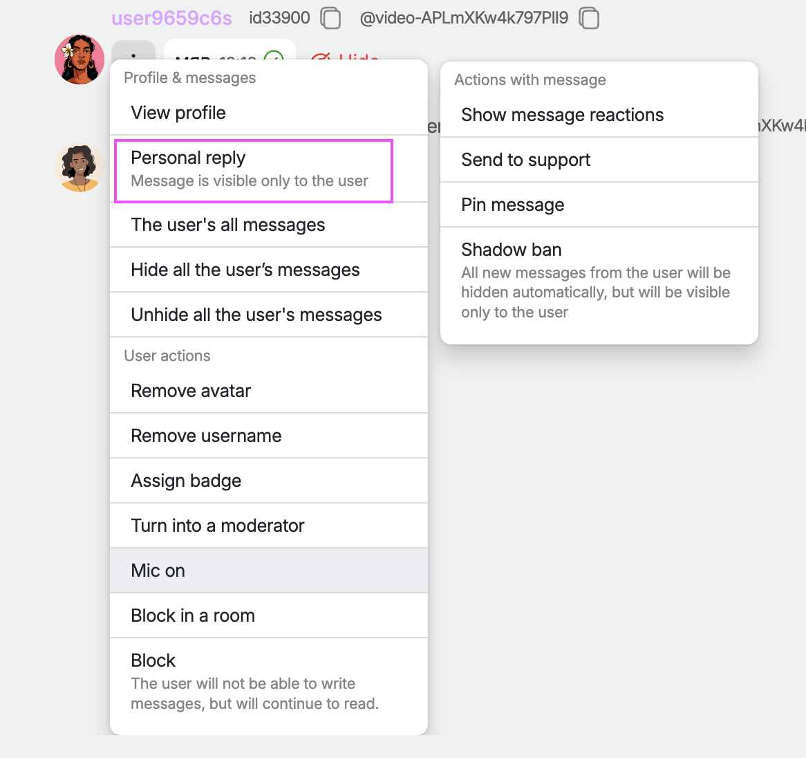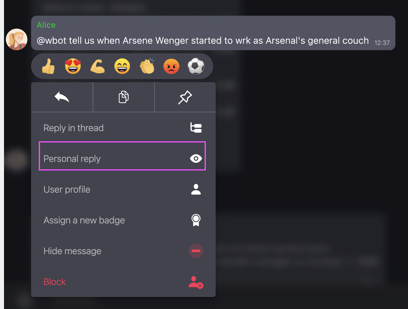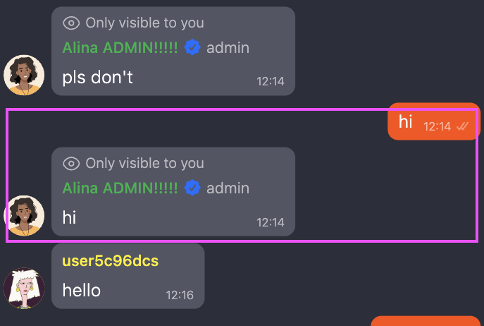Admin can also reply to the message through the chat interface. For this, they need to apply for the contextual menu of the message and choose personal reply. It will be visible for admins and for the user to whom the admin replied.