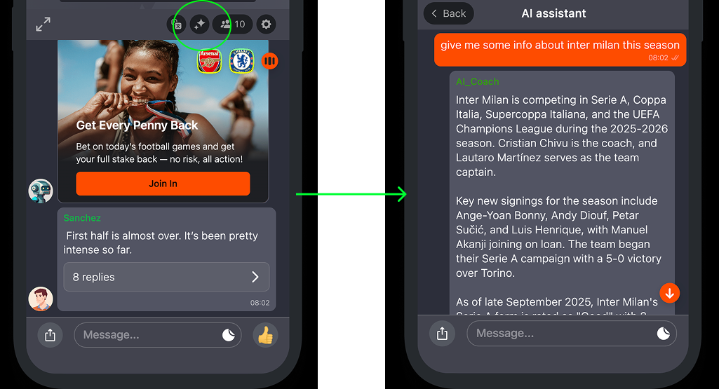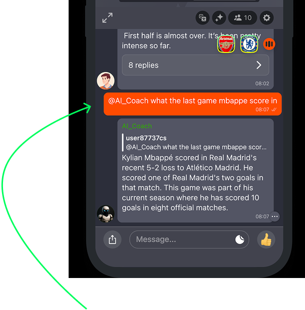 AI Sports Assistant is designed to provide your end-users with an expert-level companion for sports-related insights. Users can interact with it in either public or private chats and find all the sports-related information they need, while staying on your platform.