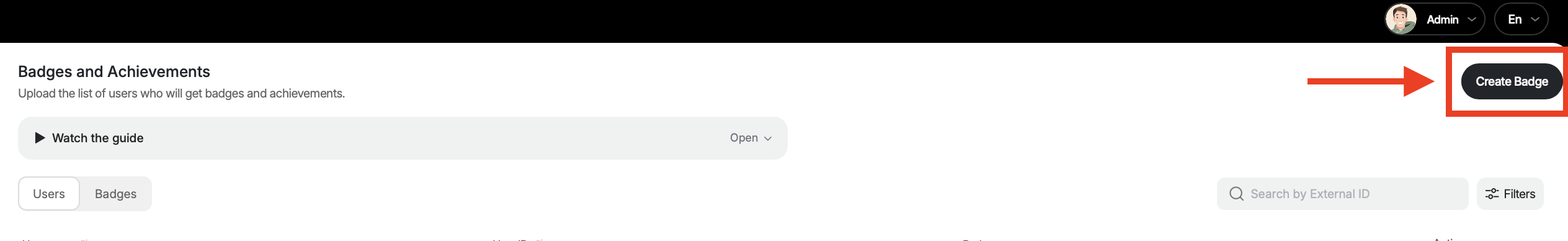 - You can assign badges to users separately. To do so, click the Assign a badge button in the top right corner, find a user with their user ID, and choose a badge you want to assign (move a toggle). Then, the user gets a badge and appears on a list of awarded users.