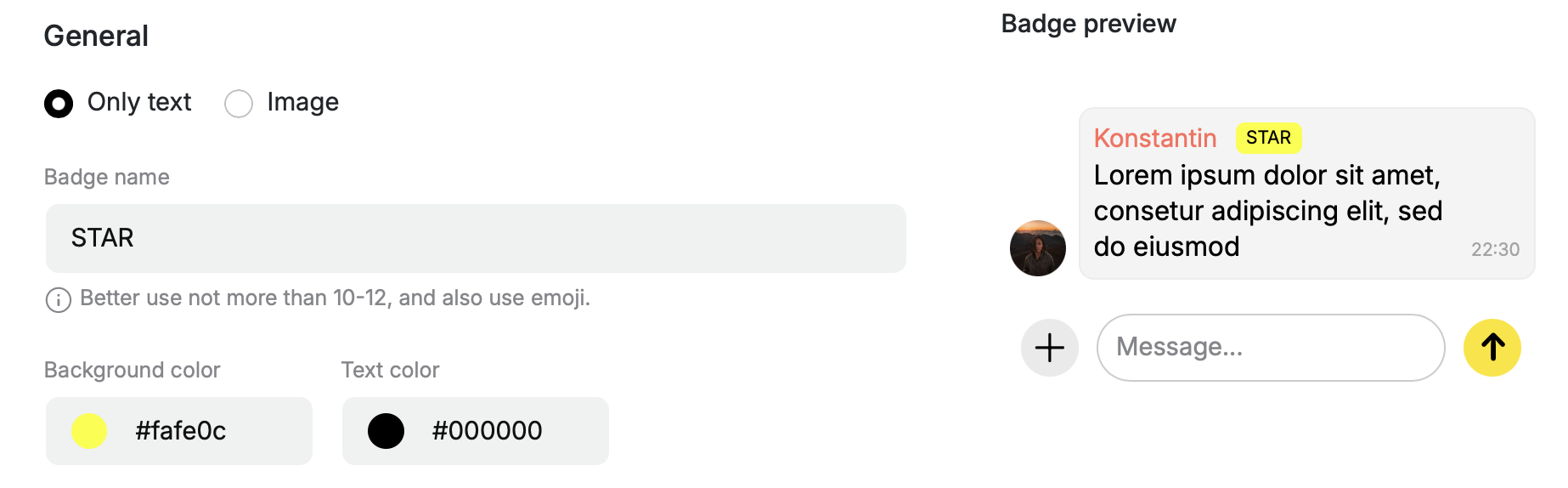 When you create a badge, you need to set the colours of the text and background. Use emojis if you wish. Check how your badge looks on the right side of the screen.