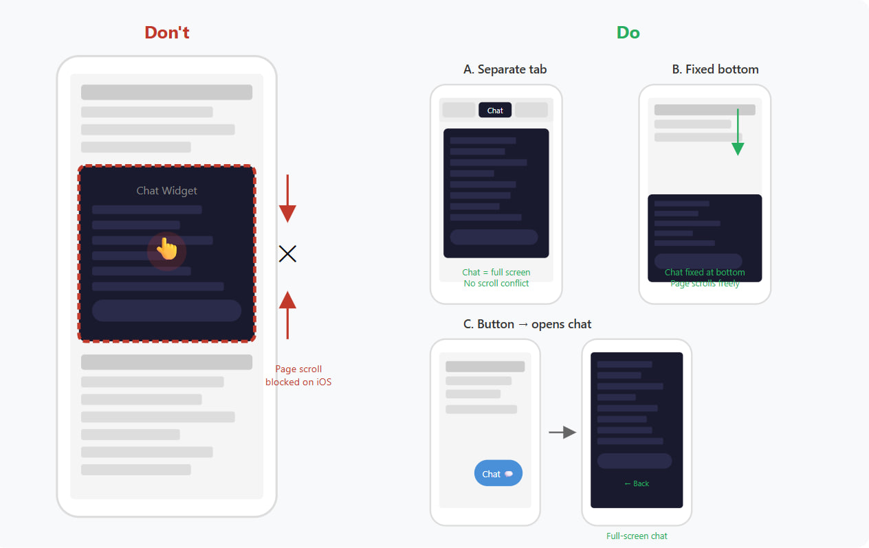 When a user's finger lands on the chat area while scrolling the page, touch events get "trapped" inside the iframe. The page stops scrolling entirely. The user has to lift their finger, move it outside the chat widget, and try again. On mobile screens, where the chat can take up most of the screen width, this makes the page nearly unusable.