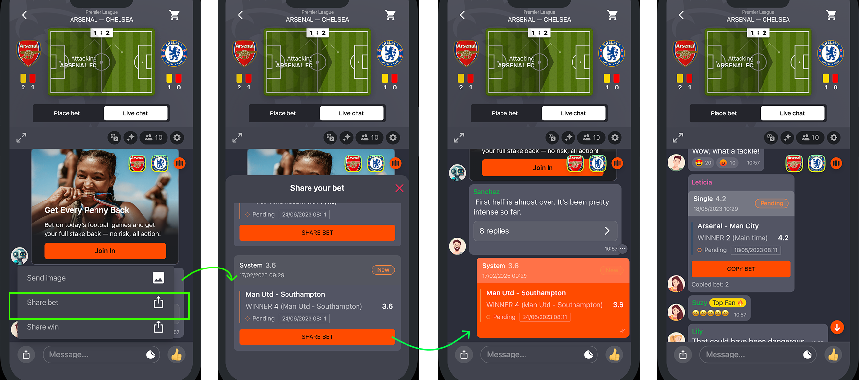 To share a bet, a user clicks the button on a chat, chooses the bet for sharing, and sends it to the chat (information about the bet, game, odds, avoiding personal data about the amount of money). Other users on the chat can repeat this bet by clicking on the widget (the bet will be put on the cart of the user who clicked it).