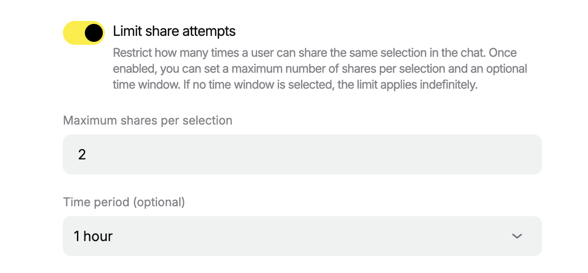 You can limit how many times a user can share the same deal in the chat. Once enabled, you can set a maximum number of shares per selection and an optional time window. If no time window is selected, the limit applies indefinitely.