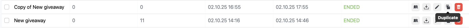 You can also create a giveaway through the "Duplicate" functionality. To do this, select the appropriate button in the table.