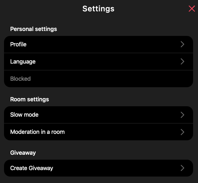 To configure via the chat room interface, the user must have admin rights. In the chat room, open the settings (gear icon) and select the corresponding section in the menu.