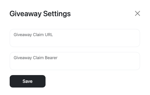 In the main window of the admin panel, you will find the primary giveaway settings. Here you can specify your endpoint and bearer token to automate the prize distribution process.