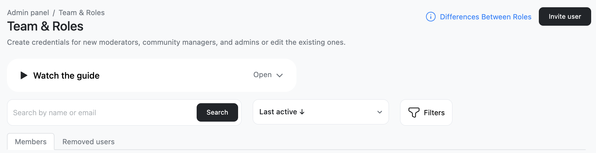 To add a new moderator or admin, click "Invite User", fill in all necessary fields, and specify the role. This person receives the invitation link via email.