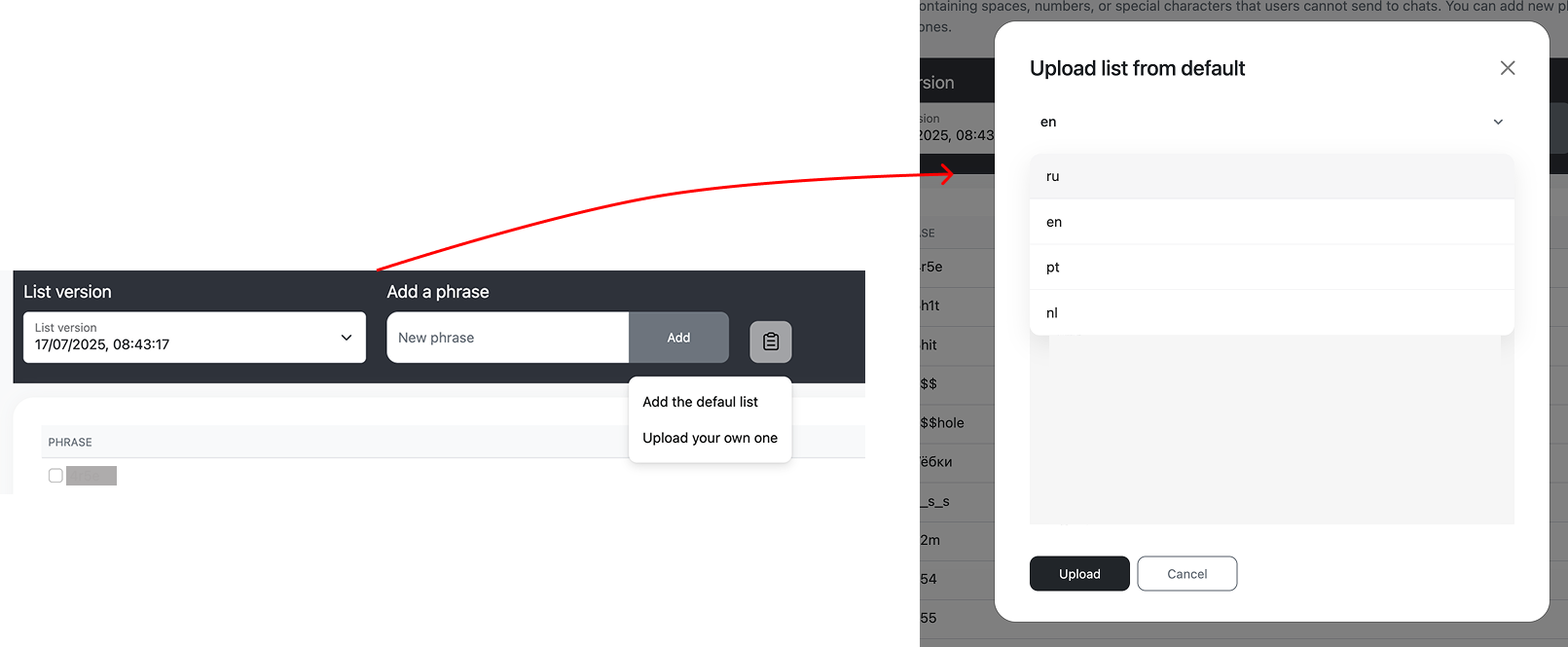 At the same time, when you add words, phrases, and links to the pre-moderation lists available on the admin panel, they are restricted to any language activated on your chats.